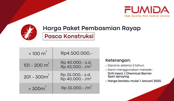 Fumida menyuguhkan garansi selama 3 hingga 5 tahun, menghadirkan keamanan jangka panjang. Jika rayap muncul kembali di dalam periode jaminan, pembeli dapat mendapatkan layanan tindak lanjut tanpa perlu cemas terhadap ongkos besar ekstra.